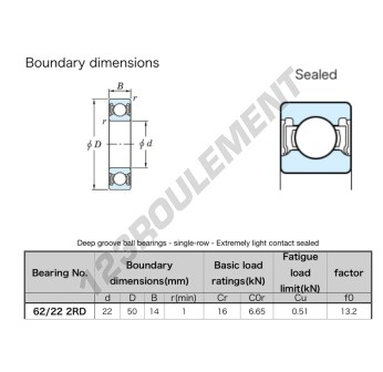 Le Roulement à Billes, connu sous la référence 62-22-2RD-JTEKT, de la marque JTEKT, possède un diamètre intérieur de 22mm, un diamètre extérieur de 50mm et une épaisseur de 14mm.