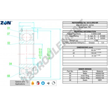 Le Roulement à Billes, connu sous la référence 6312-2RS-NR-ZEN, de la marque ZEN, possède un diamètre intérieur de 60mm, un diamètre extérieur de 130mm et une épaisseur de 31mm.