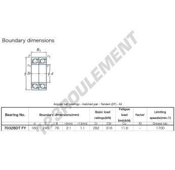 Le Roulement à Billes, connu sous la référence 7032-BDT-FY-JTEKT, de la marque JTEKT, possède un diamètre intérieur de 160mm, un diamètre extérieur de 240mm et une épaisseur de 76mm.