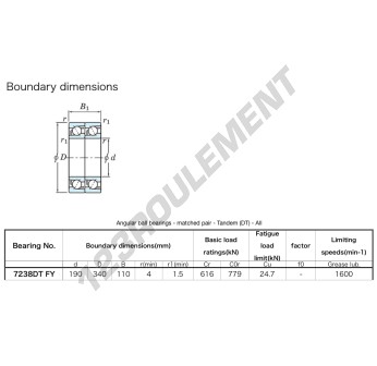 Le Roulement à Billes, connu sous la référence 7238-DT-FY-JTEKT, de la marque JTEKT, possède un diamètre intérieur de 190mm, un diamètre extérieur de 340mm et une épaisseur de 110mm.