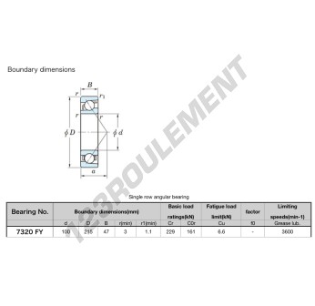 Le Roulement à Billes, connu sous la référence 7320-FY-JTEKT, de la marque JTEKT, possède un diamètre intérieur de 100mm, un diamètre extérieur de 215mm et une épaisseur de 47mm.