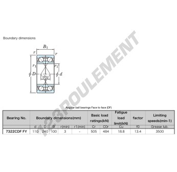 Le Roulement à Billes, connu sous la référence 7322-CDF-FY-JTEKT, de la marque JTEKT, possède un diamètre intérieur de 110mm, un diamètre extérieur de 240mm et une épaisseur de 100mm.