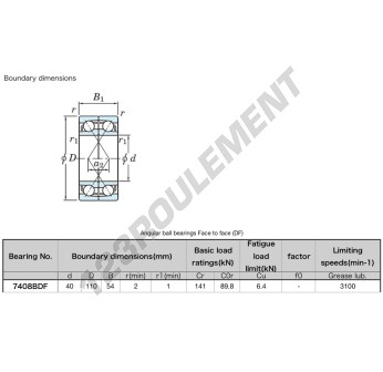 Le Roulement à Billes, connu sous la référence 7408-BDF-JTEKT, de la marque JTEKT, possède un diamètre intérieur de 40mm, un diamètre extérieur de 110mm et une épaisseur de 54mm.