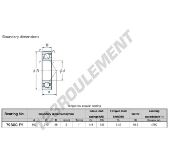 Le Roulement à Billes, connu sous la référence 7930-C-FY-JTEKT, de la marque JTEKT, possède un diamètre intérieur de 150mm, un diamètre extérieur de 210mm et une épaisseur de 28mm.