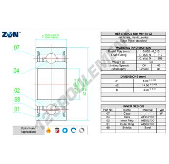 Le Roulement à Billes, connu sous la référence MR148-2Z-ZEN, de la marque ZEN, possède un diamètre intérieur de 8mm, un diamètre extérieur de 14mm et une épaisseur de 4mm.