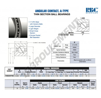 Le Roulement à Billes, connu sous la référence PG065-AR0-RBC, de la marque RBC, possède un diamètre intérieur de 165.1mm, un diamètre extérieur de 215.9mm et une épaisseur de 25.4mm.