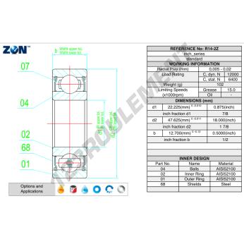 Le Roulement à Billes, connu sous la référence R14-2Z-ZEN, de la marque ZEN, possède un diamètre intérieur de 22.2mm, un diamètre extérieur de 47.6mm et une épaisseur de 12.7mm.