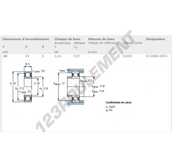 Le Roulement à Billes, connu sous la référence W61800-2RS1-SKF, de la marque SKF, possède un diamètre intérieur de 10mm, un diamètre extérieur de 19mm et une épaisseur de 5mm.