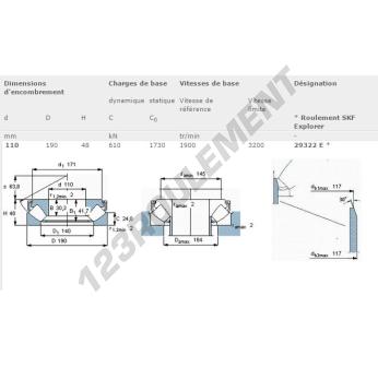 La Butée à Rouleaux, connue sous la référence 29322-E-SKF, de la marque SKF, possède un diamètre intérieur de 110 mm, un diamètre extérieur de 190 mm et une épaisseur de 48 mm.