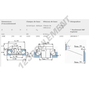 La Butée à Rouleaux, connue sous la référence 29330-E-SKF, de la marque SKF, possède un diamètre intérieur de 150 mm, un diamètre extérieur de 250 mm et une épaisseur de 60 mm.