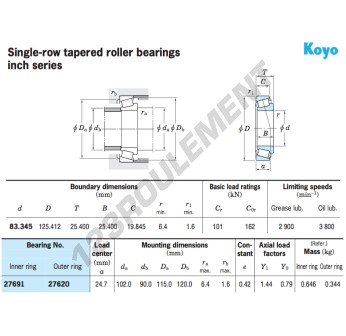 Le Roulement Conique, connu sous la référence 27691-27620-JTEKT, de la marque JTEKT, possède un diamètre intérieur de 83.345mm, un diamètre extérieur de 125.412mm et une épaisseur de 25.4mm.