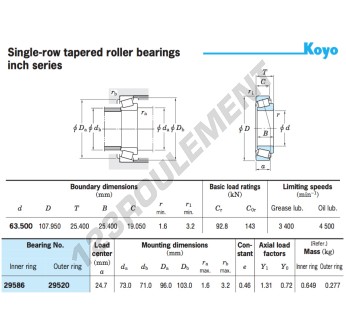 Le Roulement Conique, connu sous la référence 29586-29520-JTEKT, de la marque JTEKT, possède un diamètre intérieur de 63.5mm, un diamètre extérieur de 107.95mm et une épaisseur de 25.4mm.
