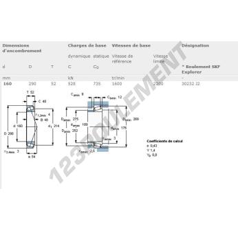 Le Roulement Conique, connu sous la référence 30232J2-SKF, de la marque SKF, possède un diamètre intérieur de 160mm, un diamètre extérieur de 290mm et une épaisseur de 52mm.