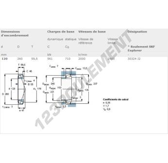Le Roulement Conique, connu sous la référence 30324-J2-SKF, de la marque SKF, possède un diamètre intérieur de 120mm, un diamètre extérieur de 260mm et une épaisseur de 59.5mm.