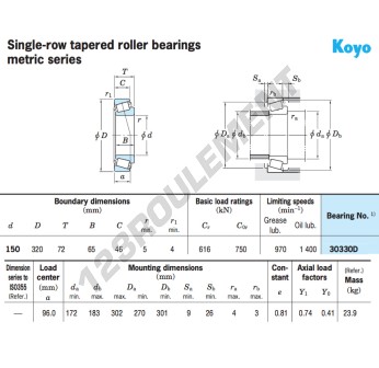 Le Roulement Conique, connu sous la référence 30330-D-JTEKT, de la marque JTEKT, possède un diamètre intérieur de 150mm, un diamètre extérieur de 320mm et une épaisseur de 72mm.
