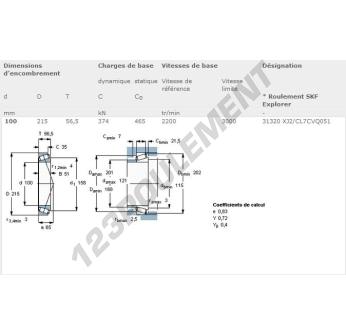Le Roulement Conique, connu sous la référence 31320XJ2-QCL7CVQ051-SKF, de la marque SKF, possède un diamètre intérieur de 100mm, un diamètre extérieur de 215mm et une épaisseur de 56.5mm.