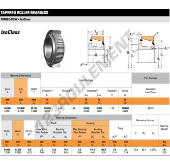 Le Roulement Conique, connu sous la référence 32213-TIMKEN, de la marque TIMKEN, possède un diamètre intérieur de 65mm, un diamètre extérieur de 120mm et une épaisseur de 32.75mm.