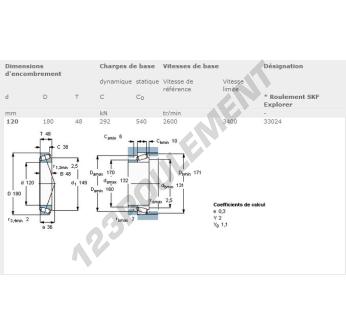 Le Roulement Conique, connu sous la référence 33024-SKF, de la marque SKF, possède un diamètre intérieur de 120mm, un diamètre extérieur de 180mm et une épaisseur de 48mm.