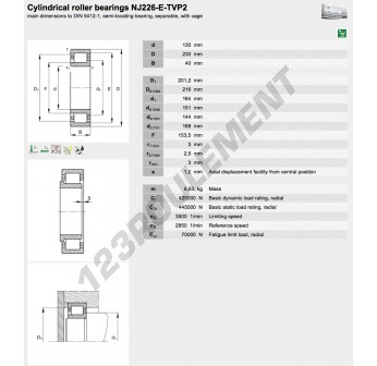 Le Roulement à Rouleaux, connu sous la référence NJ226-E-TVP2-C3-FAG, de la marque FAG, possède un diamètre intérieur de 130 mm, un diamètre extérieur de 230 mm et une épaisseur de 40 mm.