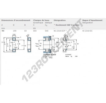 Le Roulement à Rouleaux, connu sous la référence NJ2318-ECP-SKF, de la marque SKF, possède un diamètre intérieur de 90 mm, un diamètre extérieur de 190 mm et une épaisseur de 64 mm.