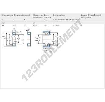 Le Roulement à Rouleaux, connu sous la référence NJ408-SKF, de la marque SKF, possède un diamètre intérieur de 40 mm, un diamètre extérieur de 110 mm et une épaisseur de 27 mm.