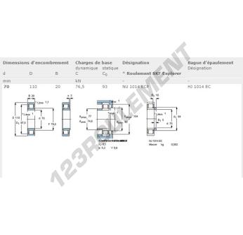 Le Roulement à Rouleaux, connu sous la référence NU1014-ECP-SKF, de la marque SKF, possède un diamètre intérieur de 70 mm, un diamètre extérieur de 110 mm et une épaisseur de 20 mm.