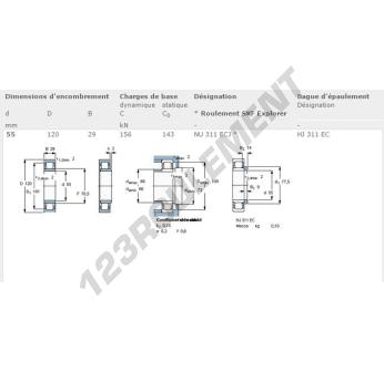 Le Roulement à Rouleaux, connu sous la référence NU311-ECJ-SKF, de la marque SKF, possède un diamètre intérieur de 55 mm, un diamètre extérieur de 120 mm et une épaisseur de 29 mm.