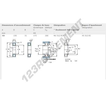 Le Roulement à Rouleaux, connu sous la référence NU312-ECP-SKF, de la marque SKF, possède un diamètre intérieur de 60 mm, un diamètre extérieur de 130 mm et une épaisseur de 31 mm.