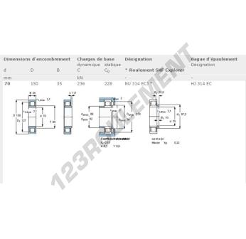 Le Roulement à Rouleaux, connu sous la référence NU314-ECJ-SKF, de la marque SKF, possède un diamètre intérieur de 70 mm, un diamètre extérieur de 150 mm et une épaisseur de 35 mm.